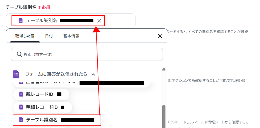 このアクションでは、検索したい項目のあるフィールド識別名と、検索条件値を設定することで、対象のレコードIDを取得できます。