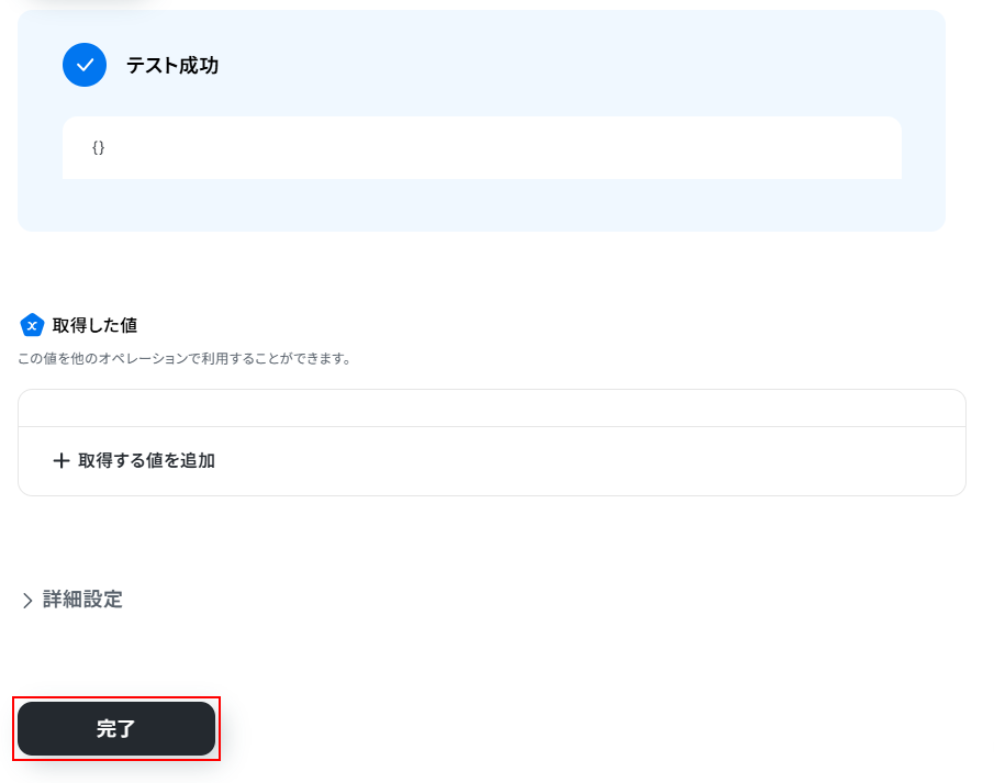 テストに成功するとテスト成功画面と取得した値が表示されますのでご確認ください。