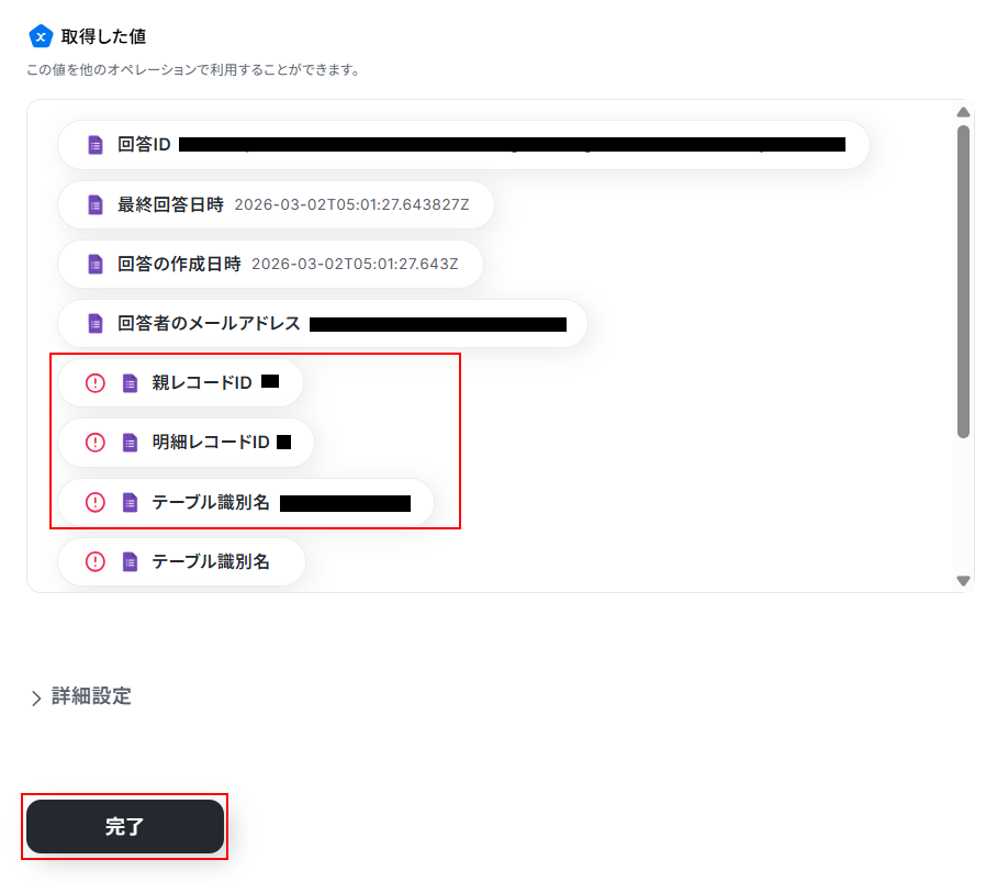 明細レコードIDにはデフォルトで取得した値が設定されていますので確認しましょう。