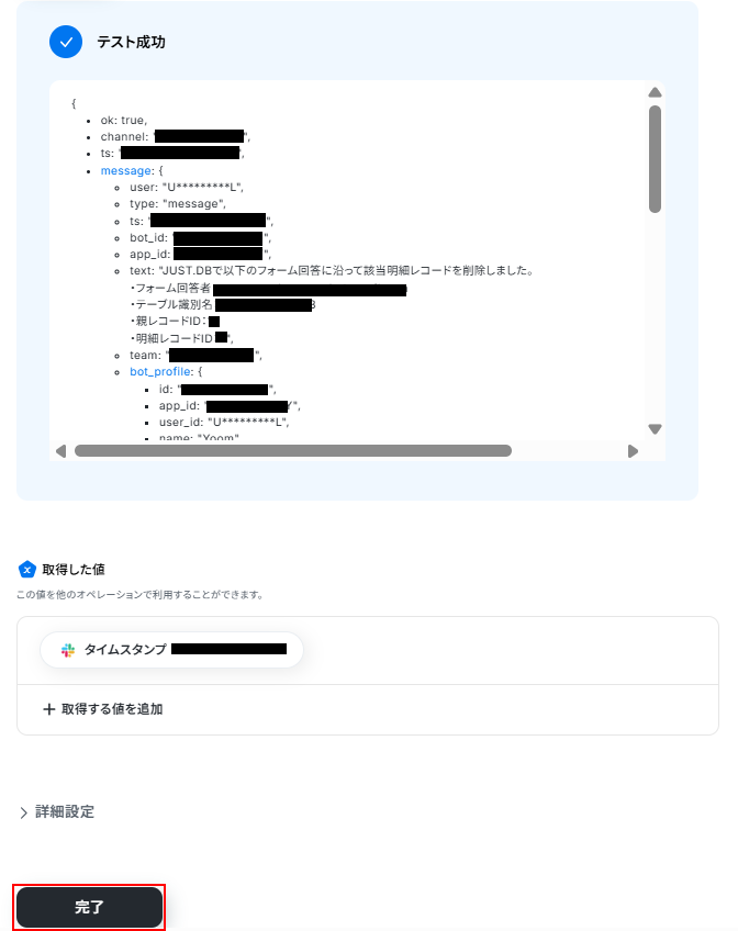 テストに成功すると、テスト成功画面と取得した値が表示されますのでご確認ください。