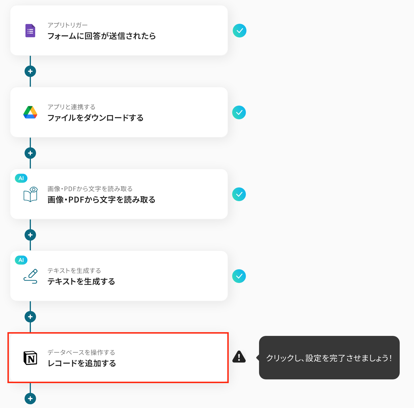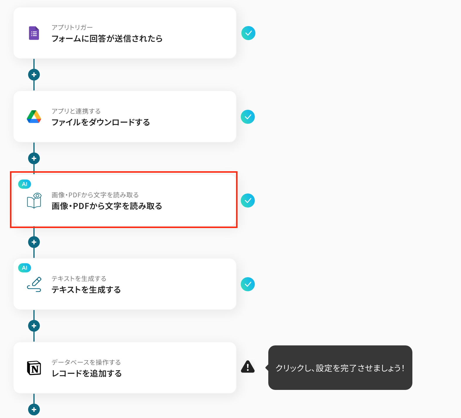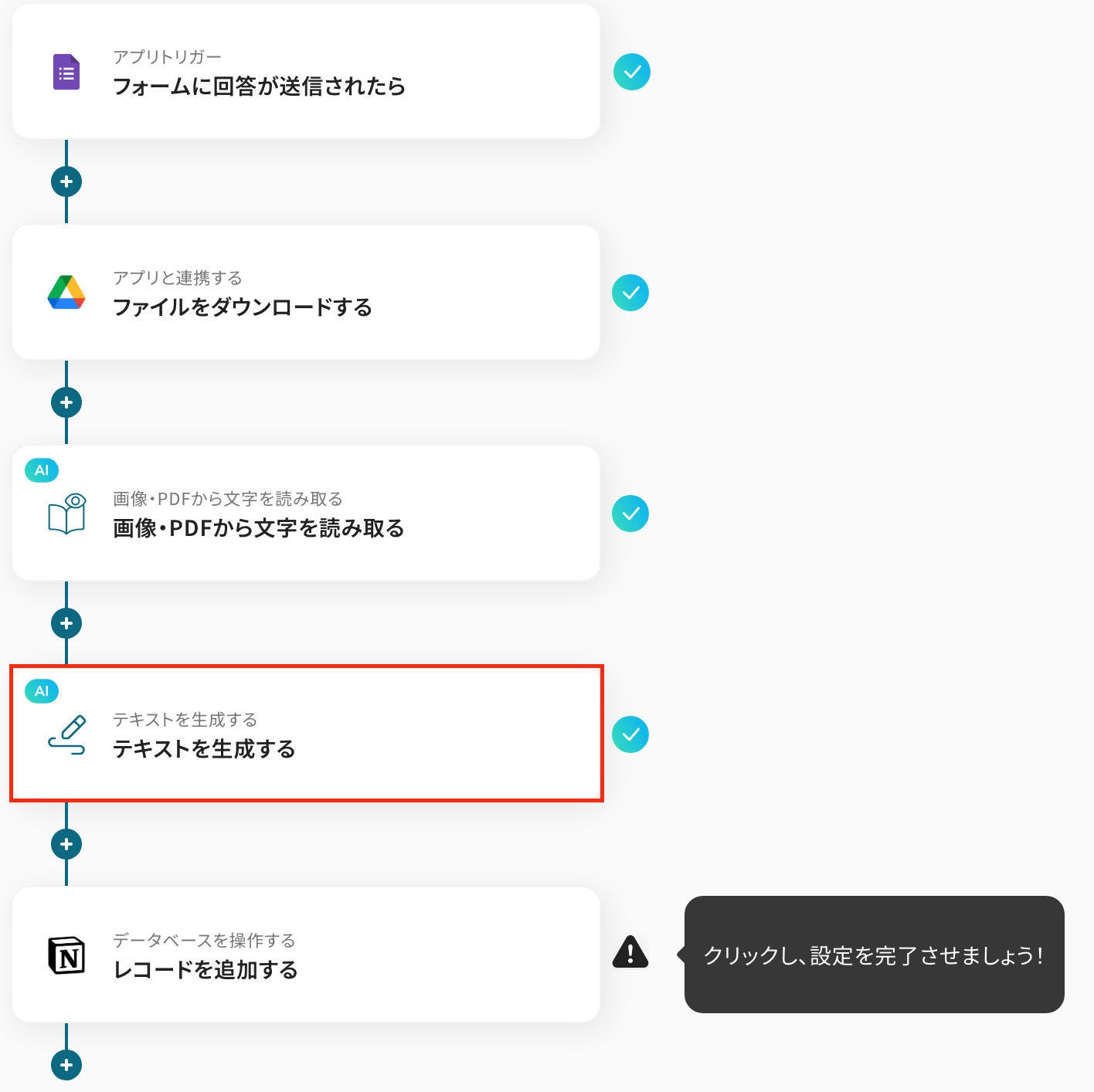 - Googleフォームのトリガー、OCR・AI(テキスト生成)のオペレーション、Notionのアクション設定