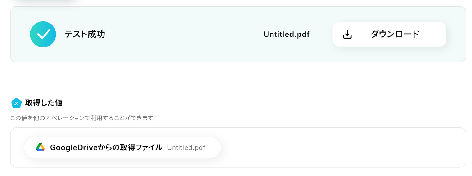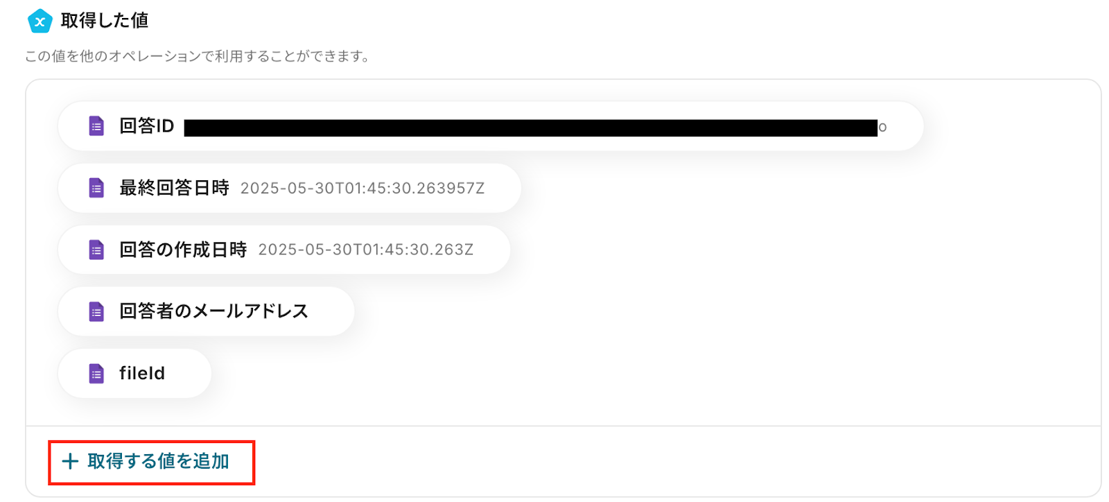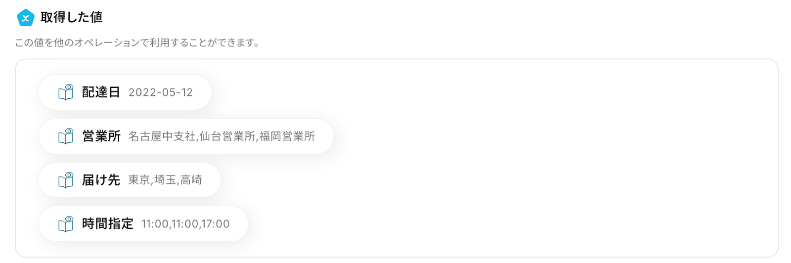 抽出したい項目の内容はアウトプットとして取得でき、この後の設定で使用できるようになります。