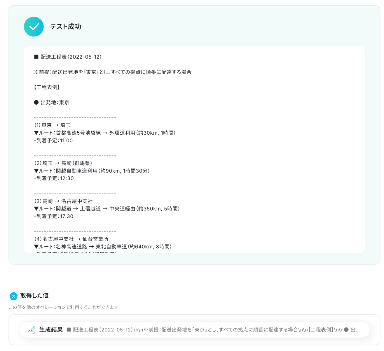 入力が完了したら、「テスト」を実行して、生成結果が反映していればOKです!