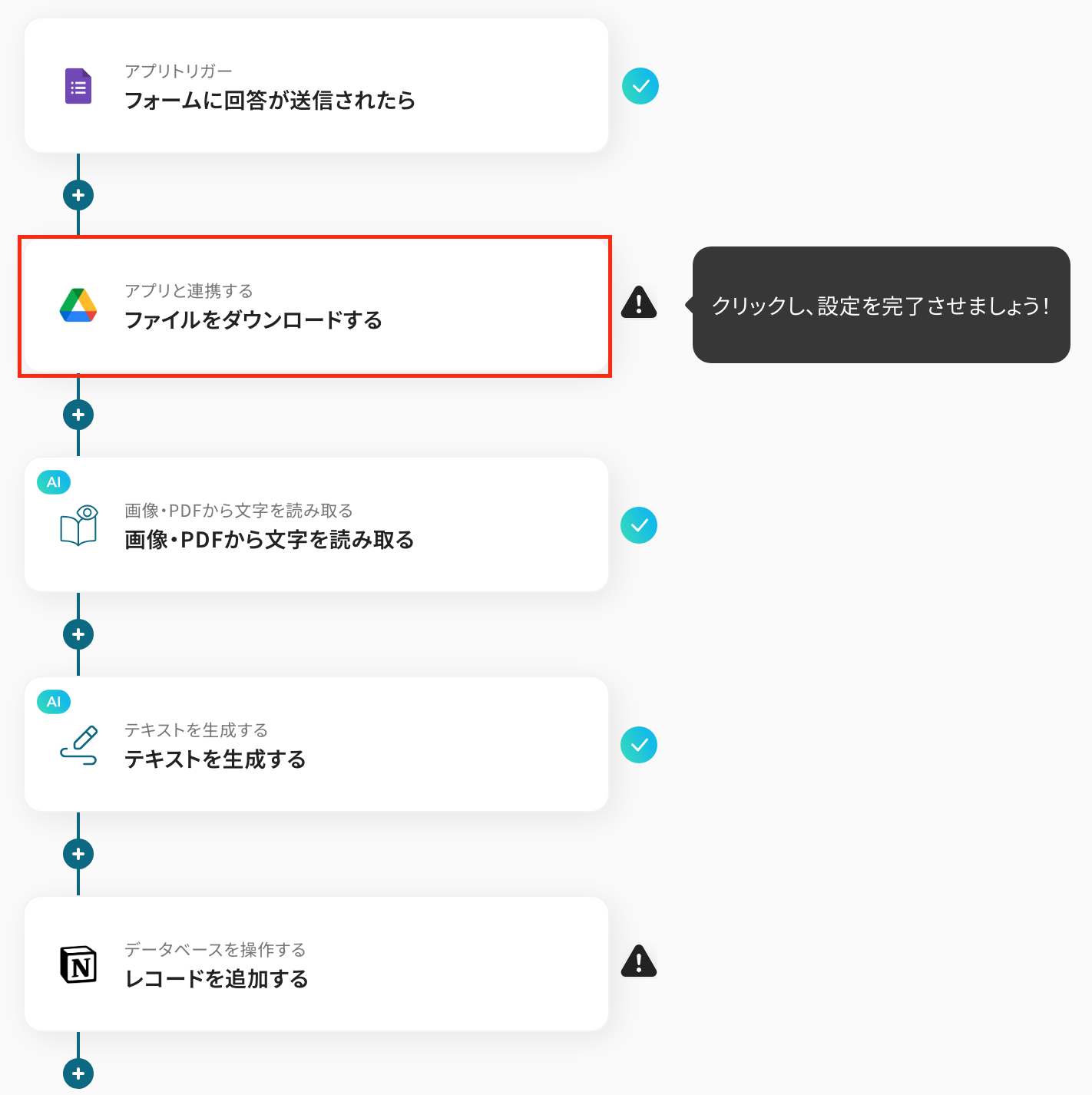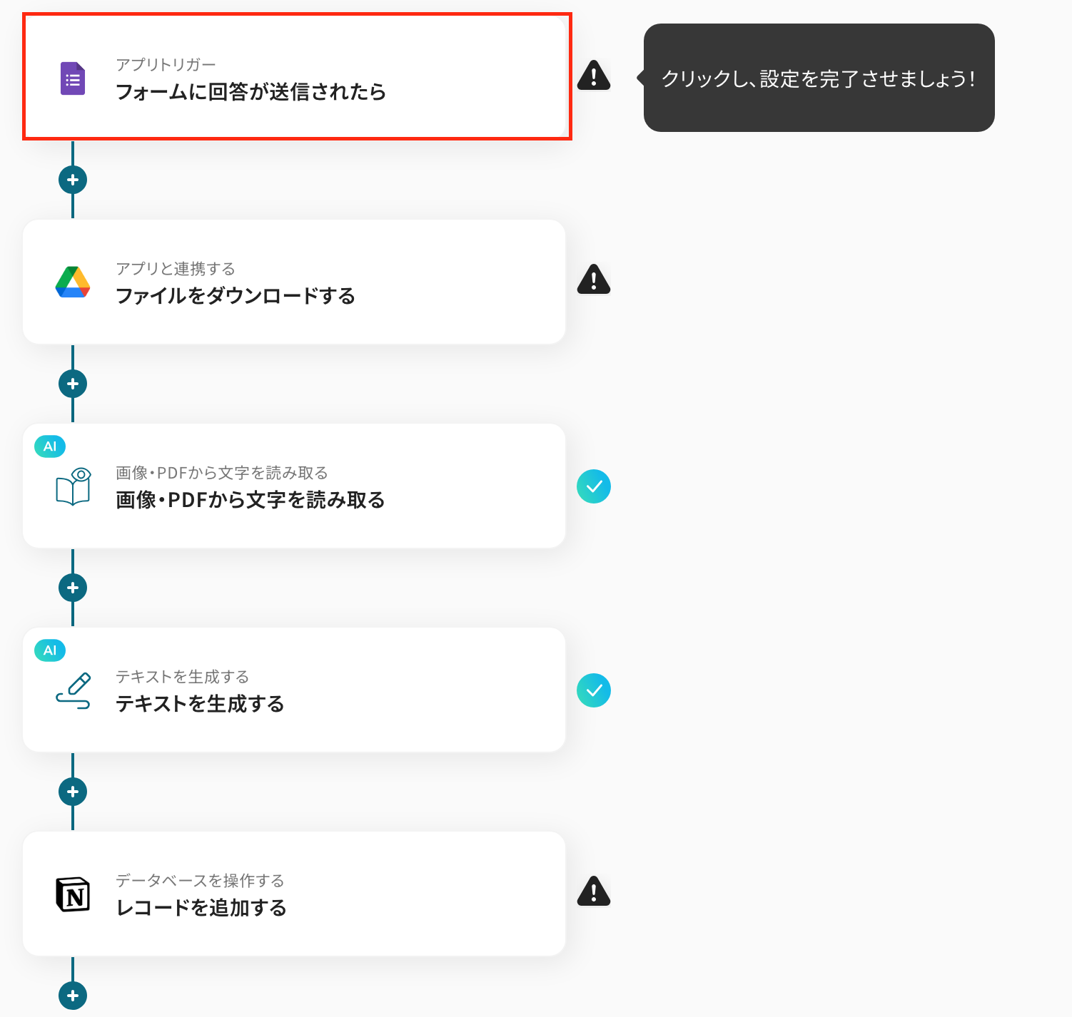 ここから、「Googleフォームで配送データが送信されたら、OCRで読み取りAIで配送予定を出力してNotionに追加する」フローを設定していきます。
