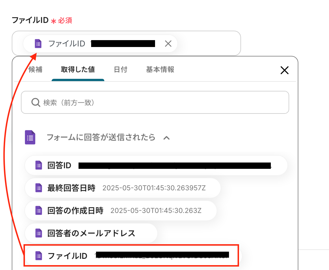 まず「ファイルの添付方法」を選択します。今回は取得した値を使用するため、以下のようにプルダウンより選択してください。