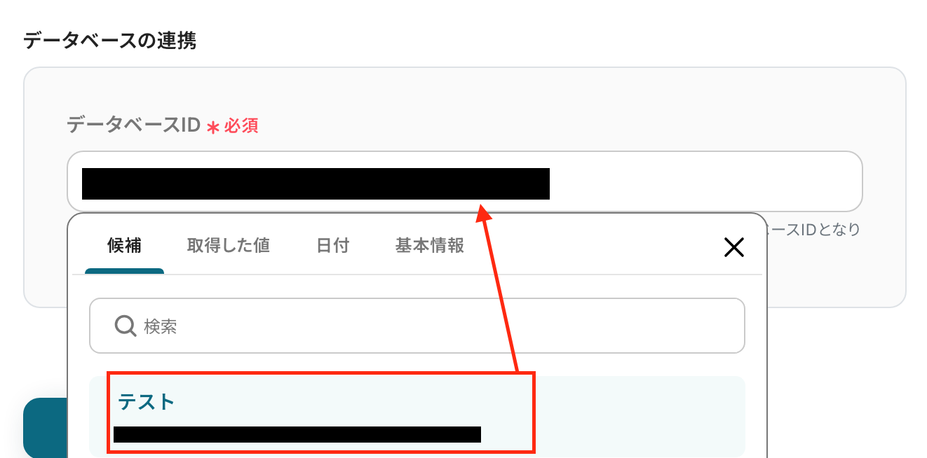 「データベースID」は、入力欄をクリックして表示される候補から選択してください。