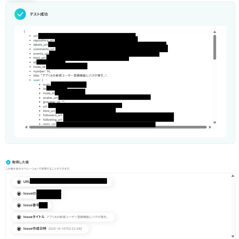 テストに成功すると「取得した値」に反映されます。詳しくは以下をご覧ください。