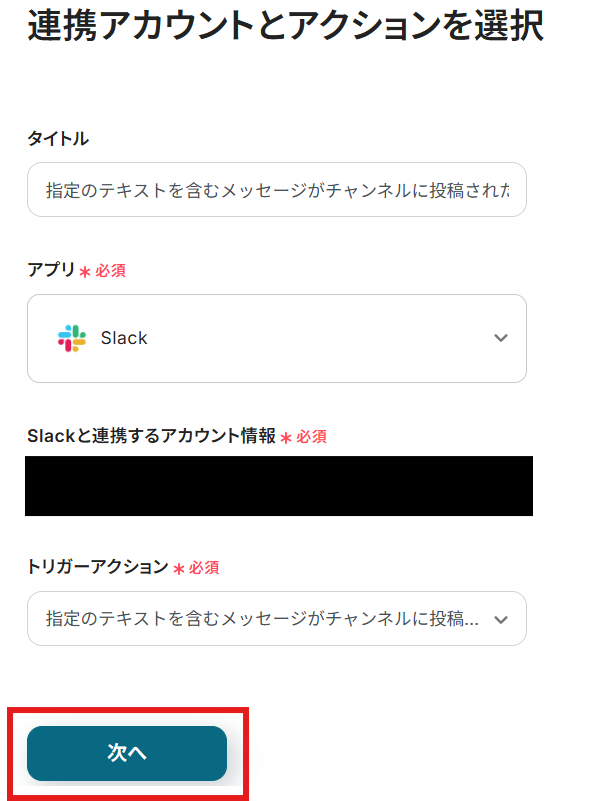 タイトルと連携するアカウント情報を確認し、アクションはテンプレート通りのまま「次へ」をクリックして進んでください。