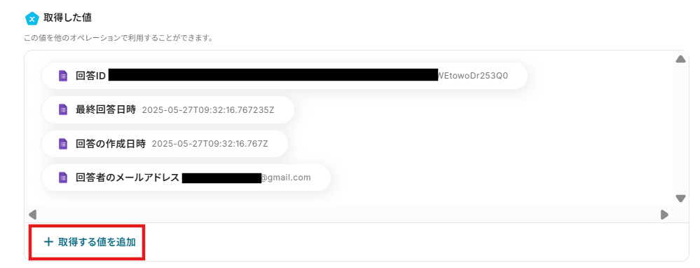 ・Googleフォームをトリガーとして使用した際の回答内容を取得する方法は下記を参照ください。