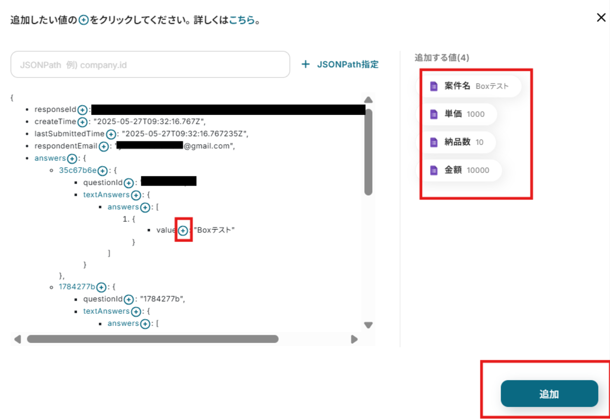 テストが成功したら、Googleフォームの回答をJSONPATHを使って取得しましょう。