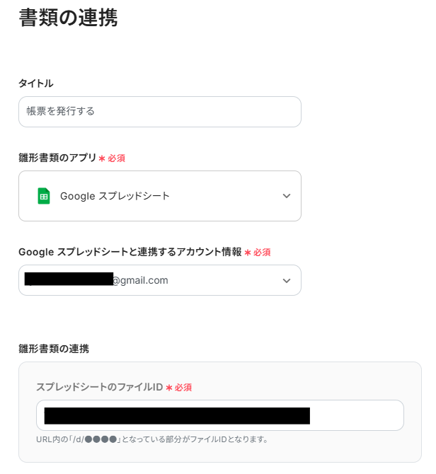 タイトルと連携するアカウント情報を任意で設定し、「スプレッドシートのファイルID」を入力します。