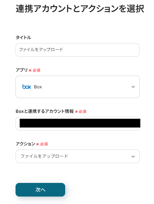 先ほどと同様にタイトルと連携するアカウント情報を任意で設定し、アクションはテンプレート通りに「ファイルをアップロード」のまま「次へ」をクリックして進んでください。