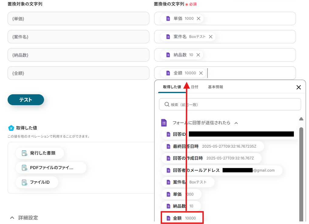 4.続いて、「置換後の文字列」の項目にアウトプットから該当する情報を選択して入力します。