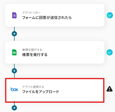 フォームに回答された内容をもとに帳票を自動生成し、PDF形式でBoxに保存する業務ワークフローです。