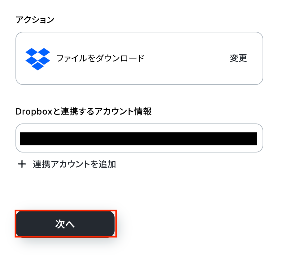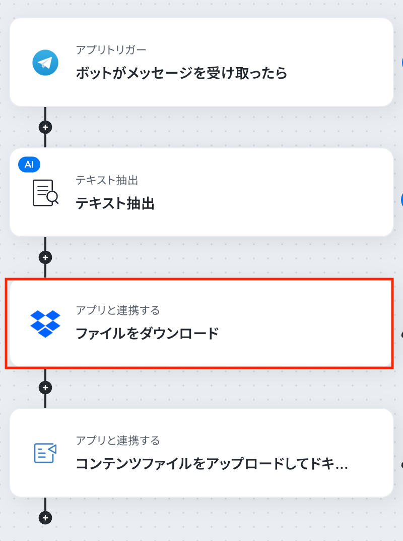 - 次に、オペレーションでDropboxの「ファイルをダウンロードする」アクションを設定し、前のステップで抽出した情報を基にファイルを指定します。