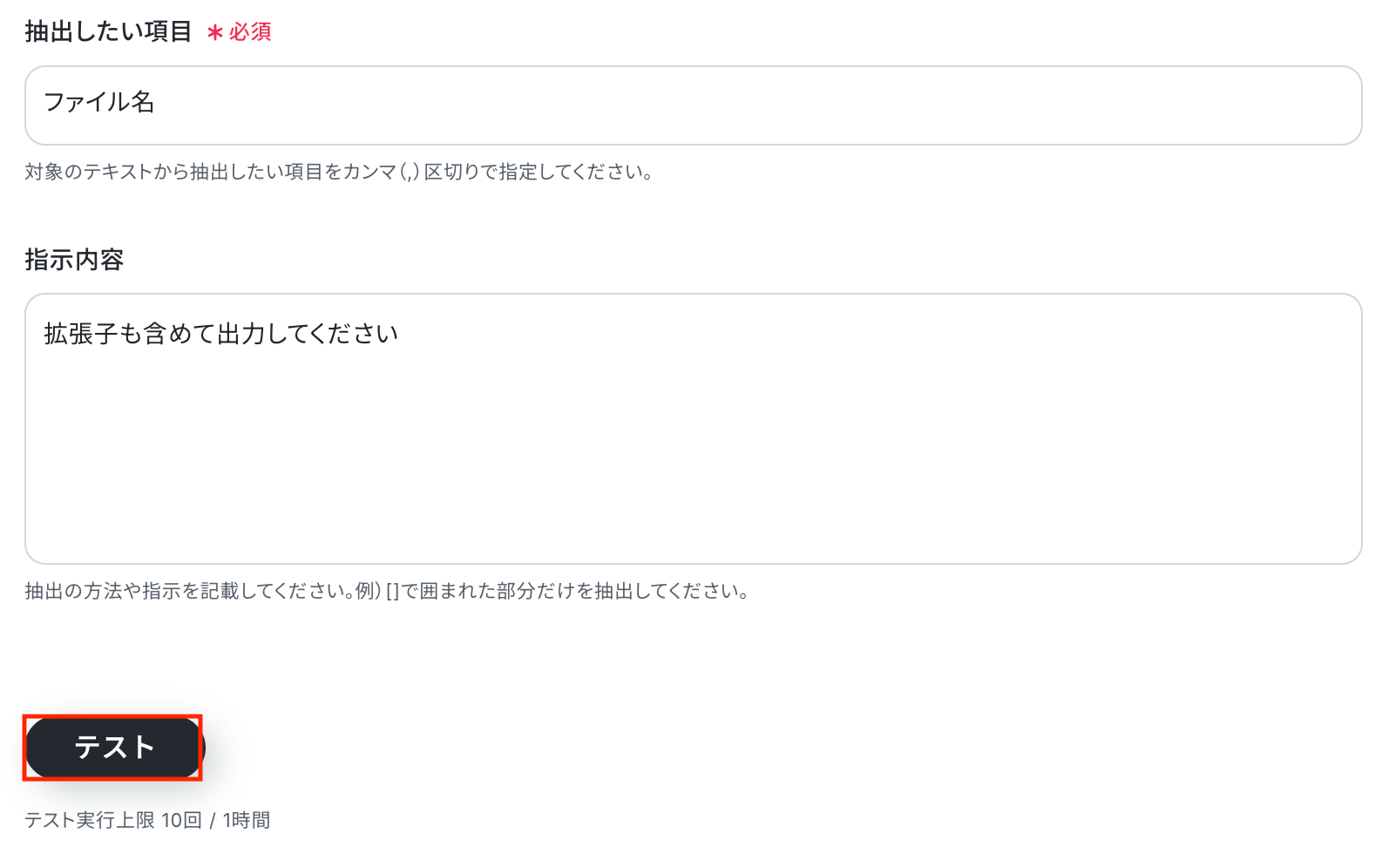 - AI機能のオペレーションでは、Telegramで受信したメッセージ本文から、ファイル名など抽出したいテキスト項目を任意で設定することが可能です。