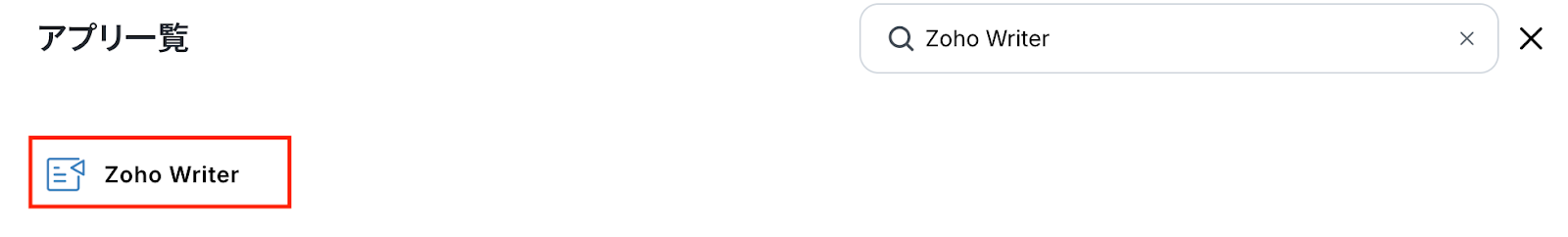 新規接続をクリックしたあと、アプリのメニュー一覧が表示されるのでZoho Writerと検索し、対象アプリをクリックしてください。