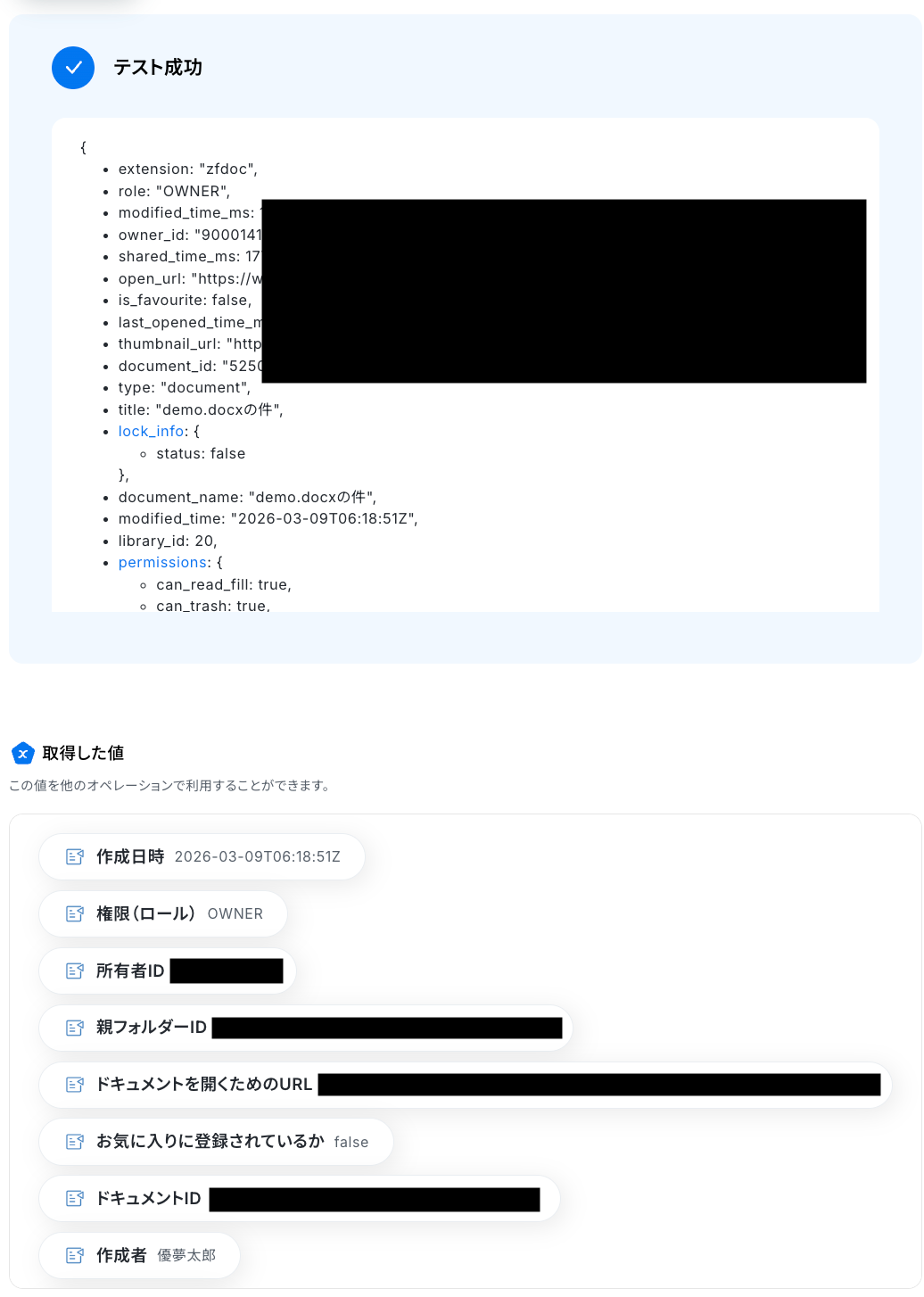 - Zoho Writerの「ドキュメント一覧取得」アクションでは、取得対象とするドキュメントの条件などを任意で設定することが可能です。