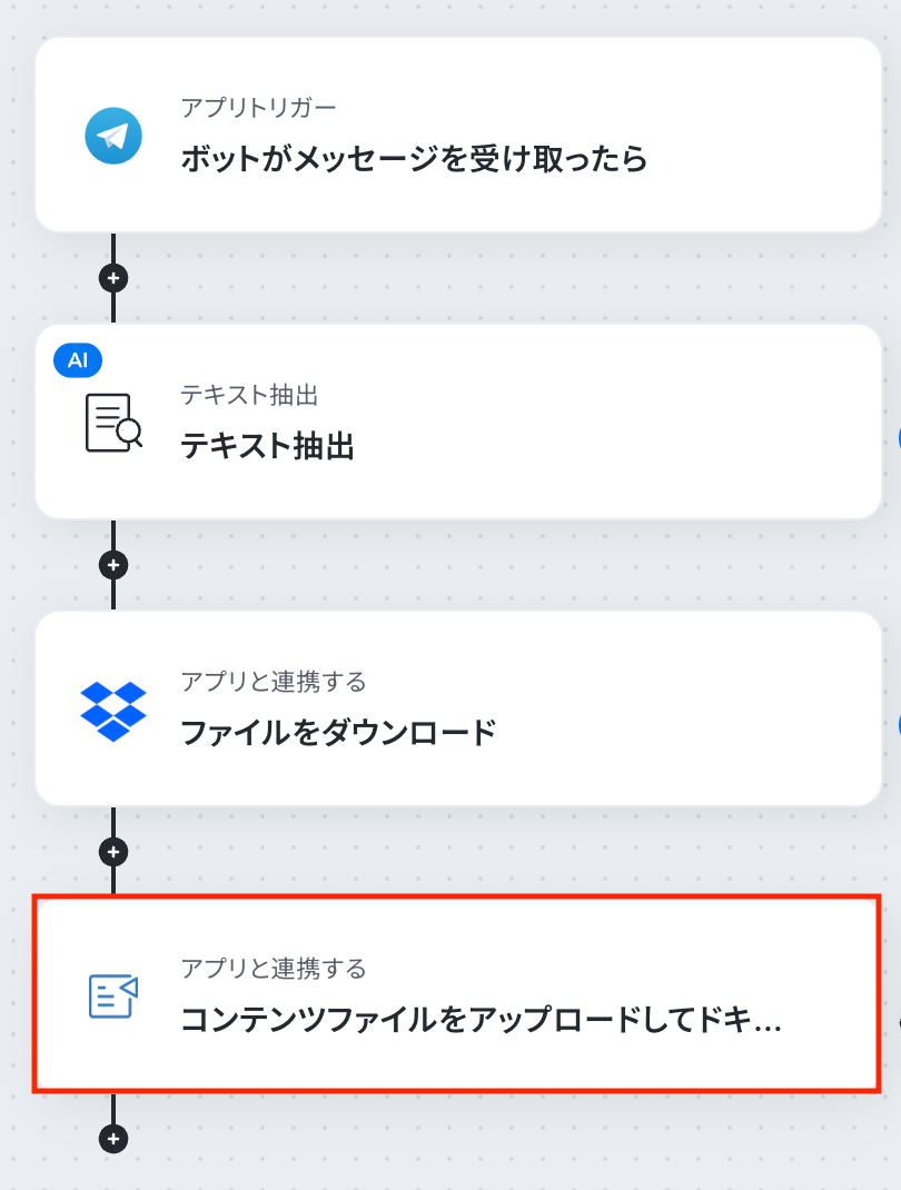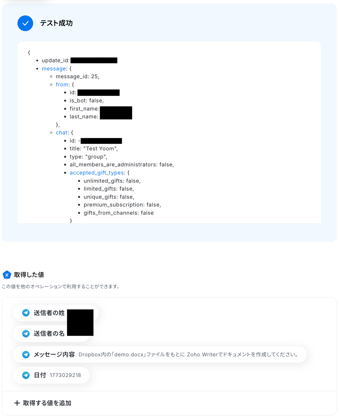 - Telegramのメッセージ受信を起点に、Dropboxからのファイル取得とZoho Writerでのドキュメント作成までの一連の連携が自動で実行されるため、手作業の時間を削減できます。