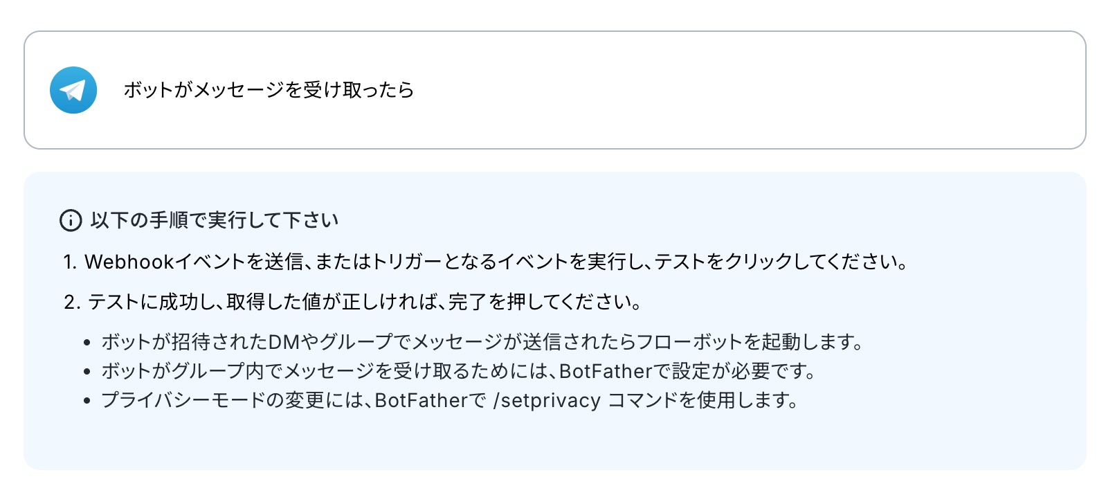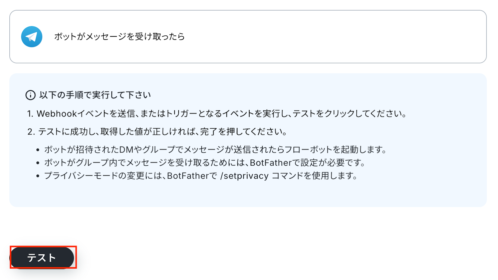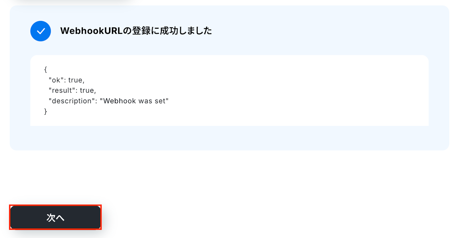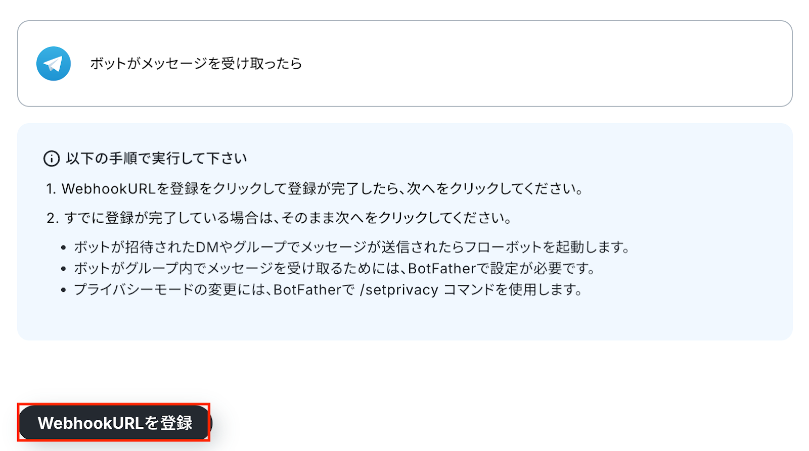 「WebhookURLを登録」をクリックして、YoomがTelegramからWebhookを正しく受け取れるか確認しましょう。