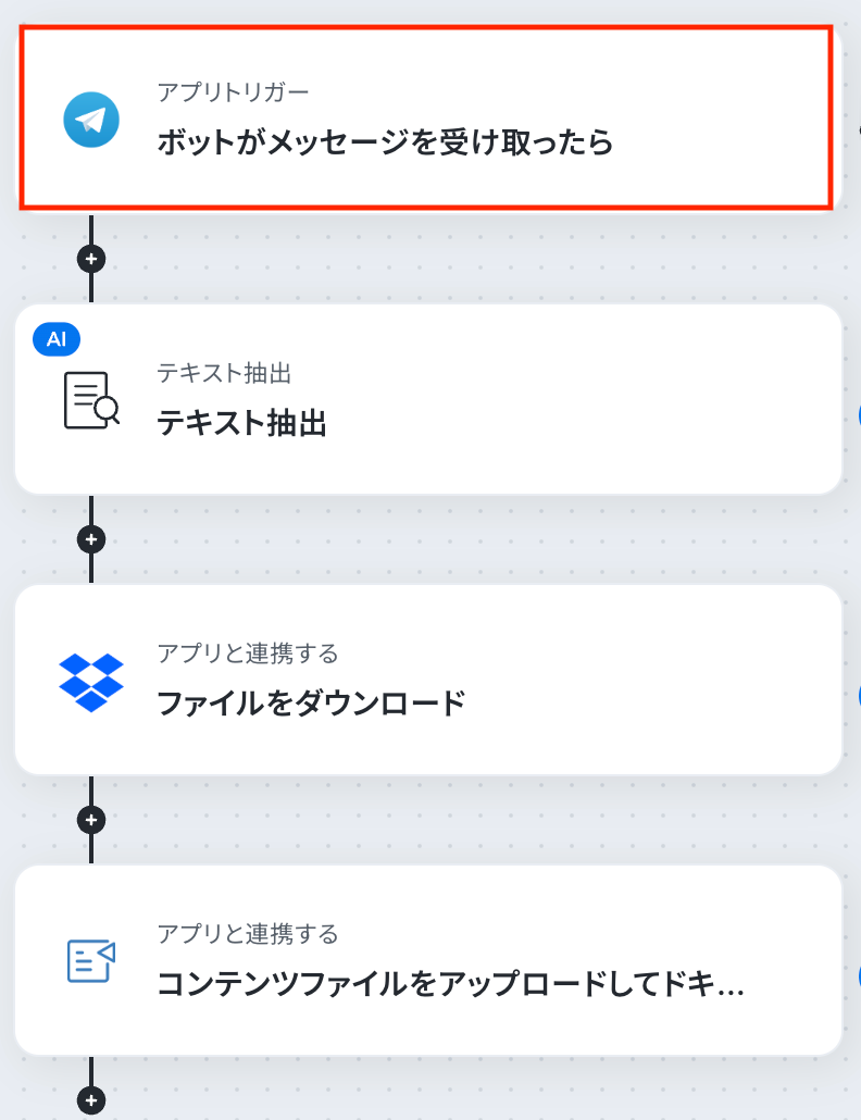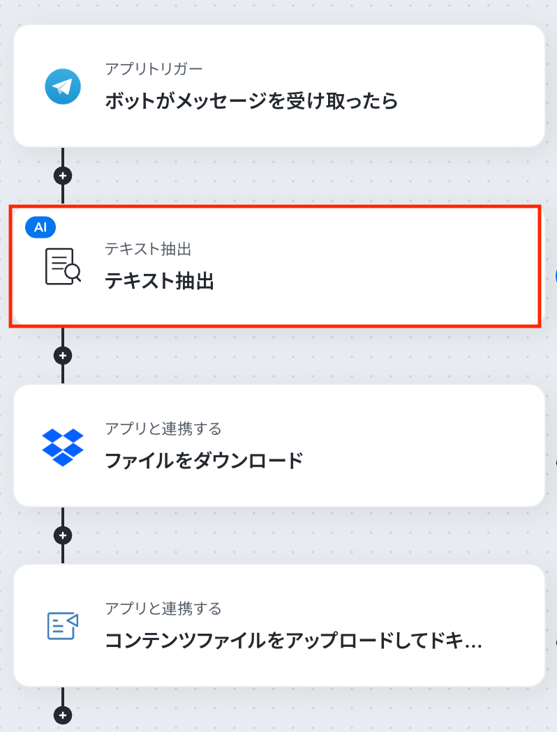 続いて、トリガーのステップでTelegramから取得した値を利用して、後続ステップに必要なテキストを抽出する設定を行いましょう。