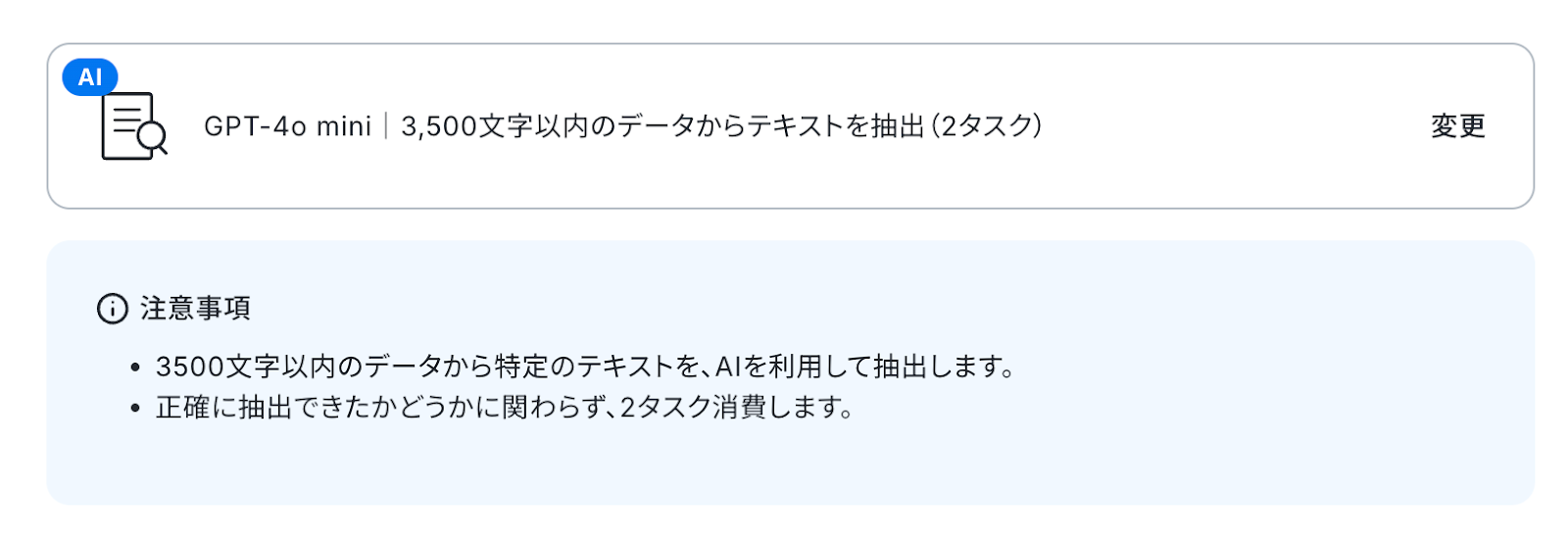 変換タイプは「GPT-4o mini|3,500文字以内のデータからテキストを抽出(2タスク)」 がデフォルトで設定されているため、そのまま内容を確認してください。