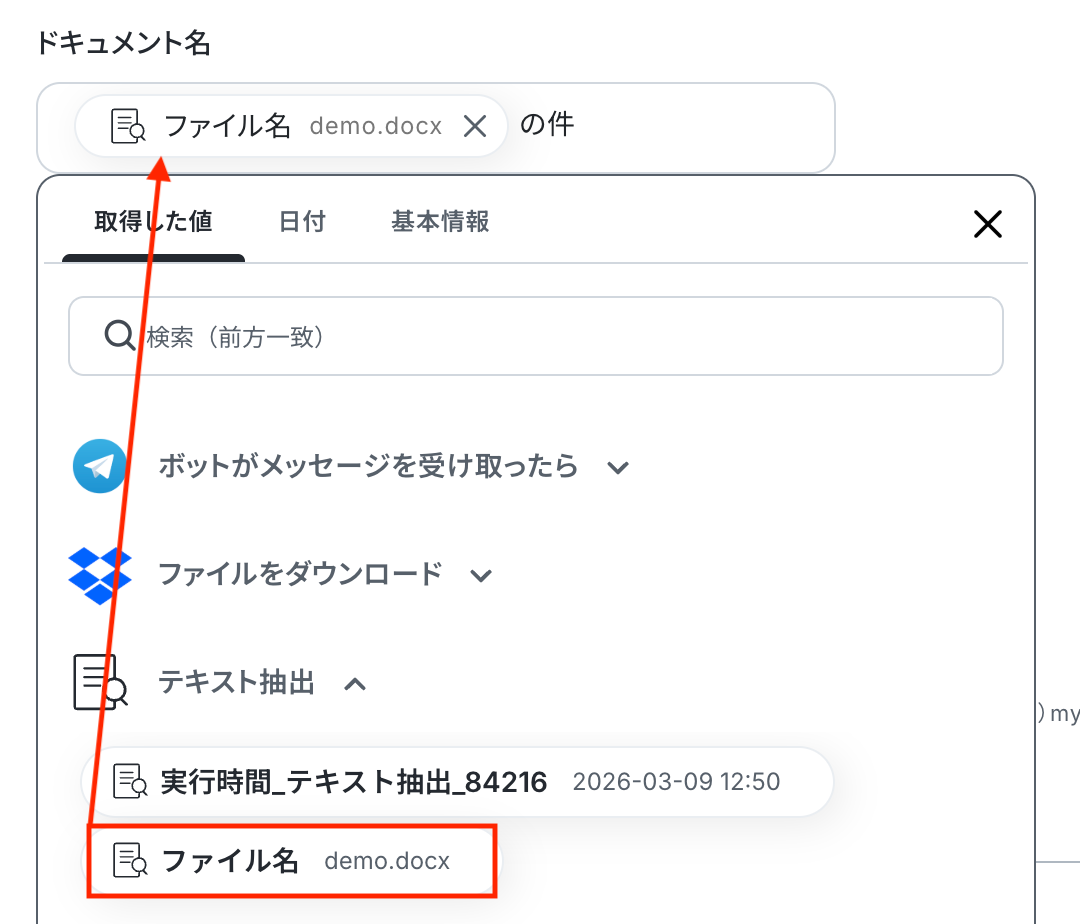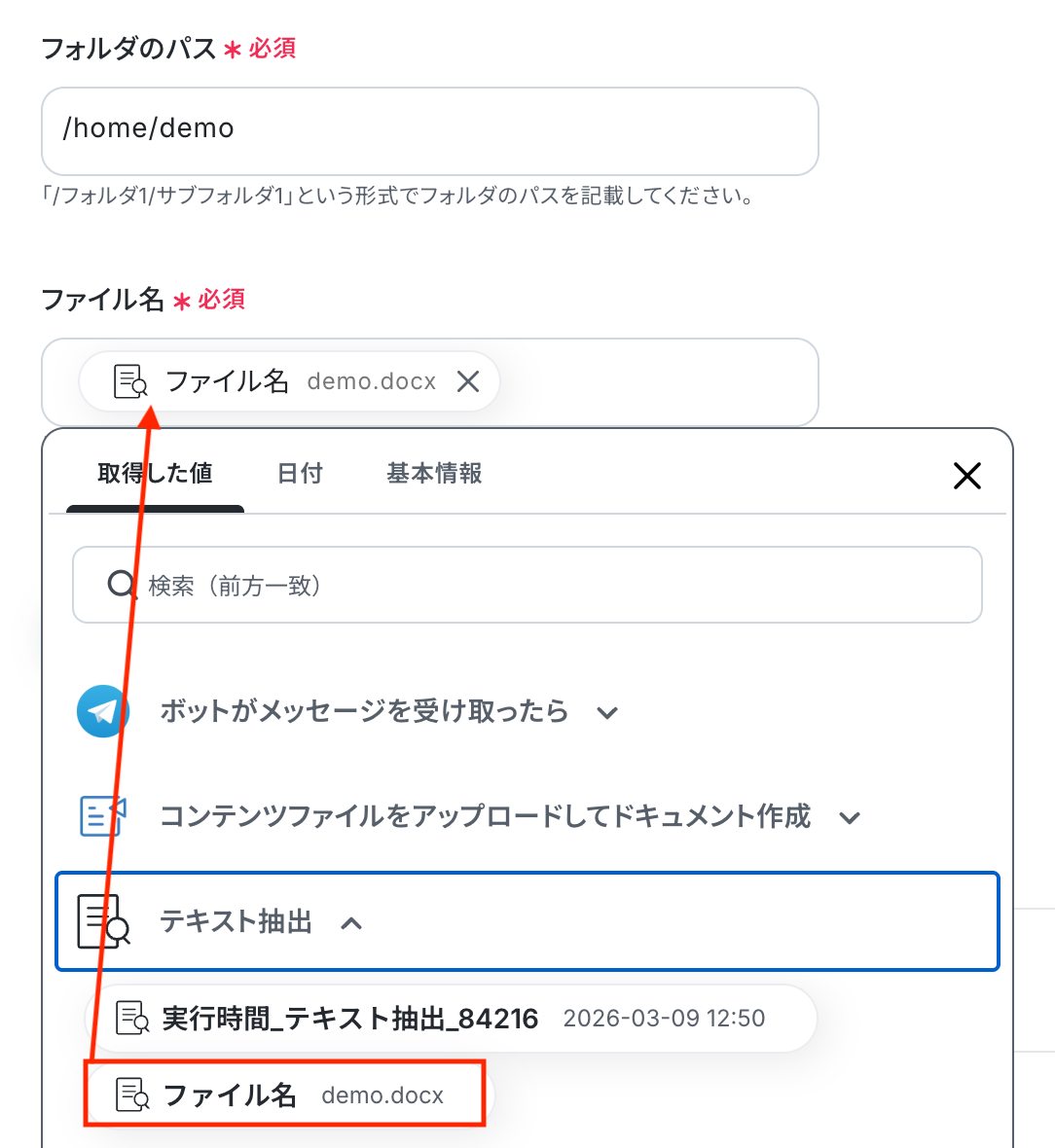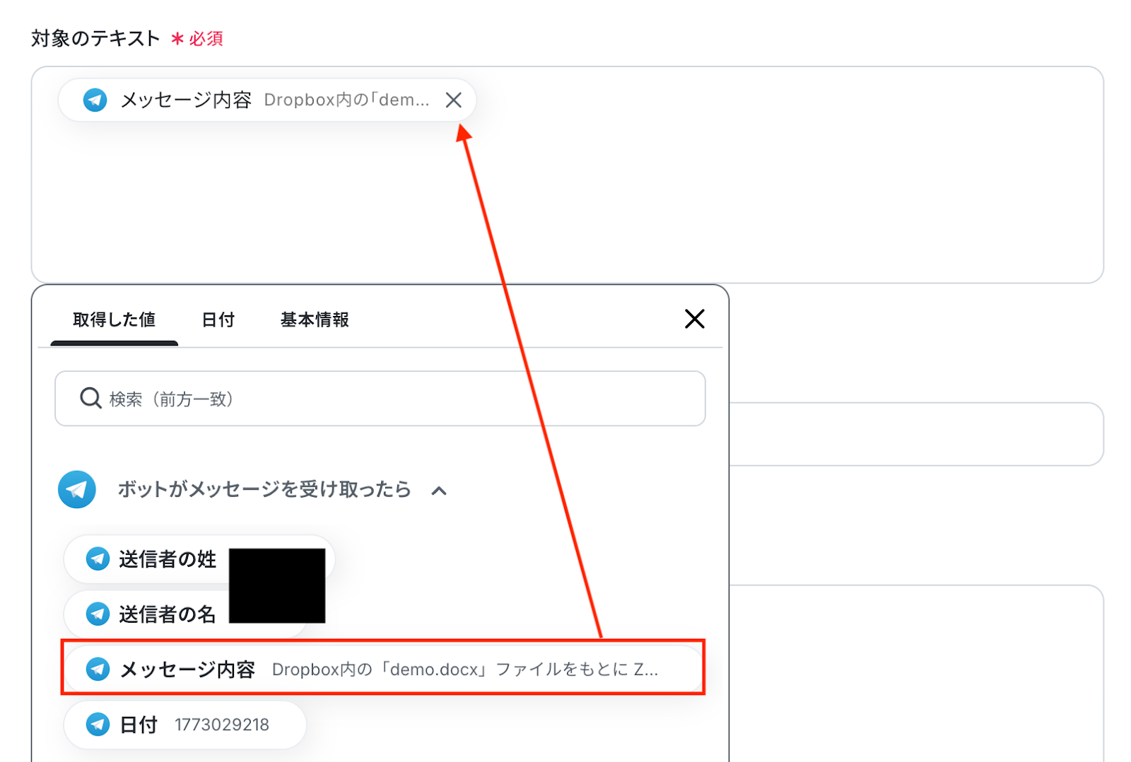 入力欄をクリックすると、前のステップでTelegramから取得した値が表示されるので、選択して入力しましょう。