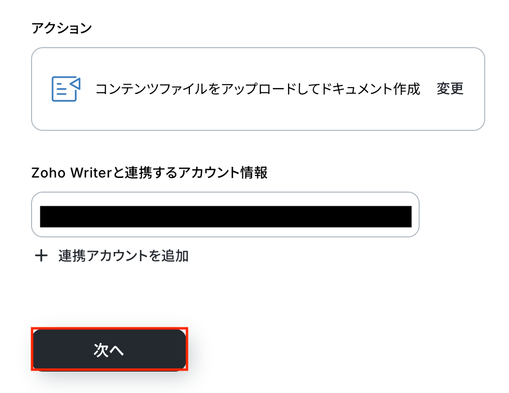 - 最後に、Zoho Writerの「コンテンツファイルをアップロードしてドキュメント作成」アクションを設定し、ダウンロードしたファイルをアップロードしてドキュメントを自動作成します。