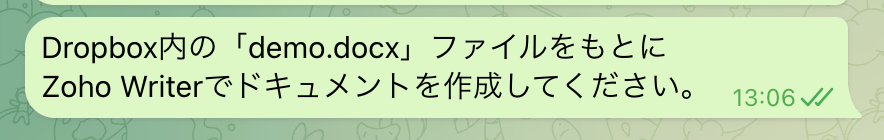 Telegramでメッセージを受け取ったら、DropboxからファイルをダウンロードしZoho Writerにドキュメントを作成する