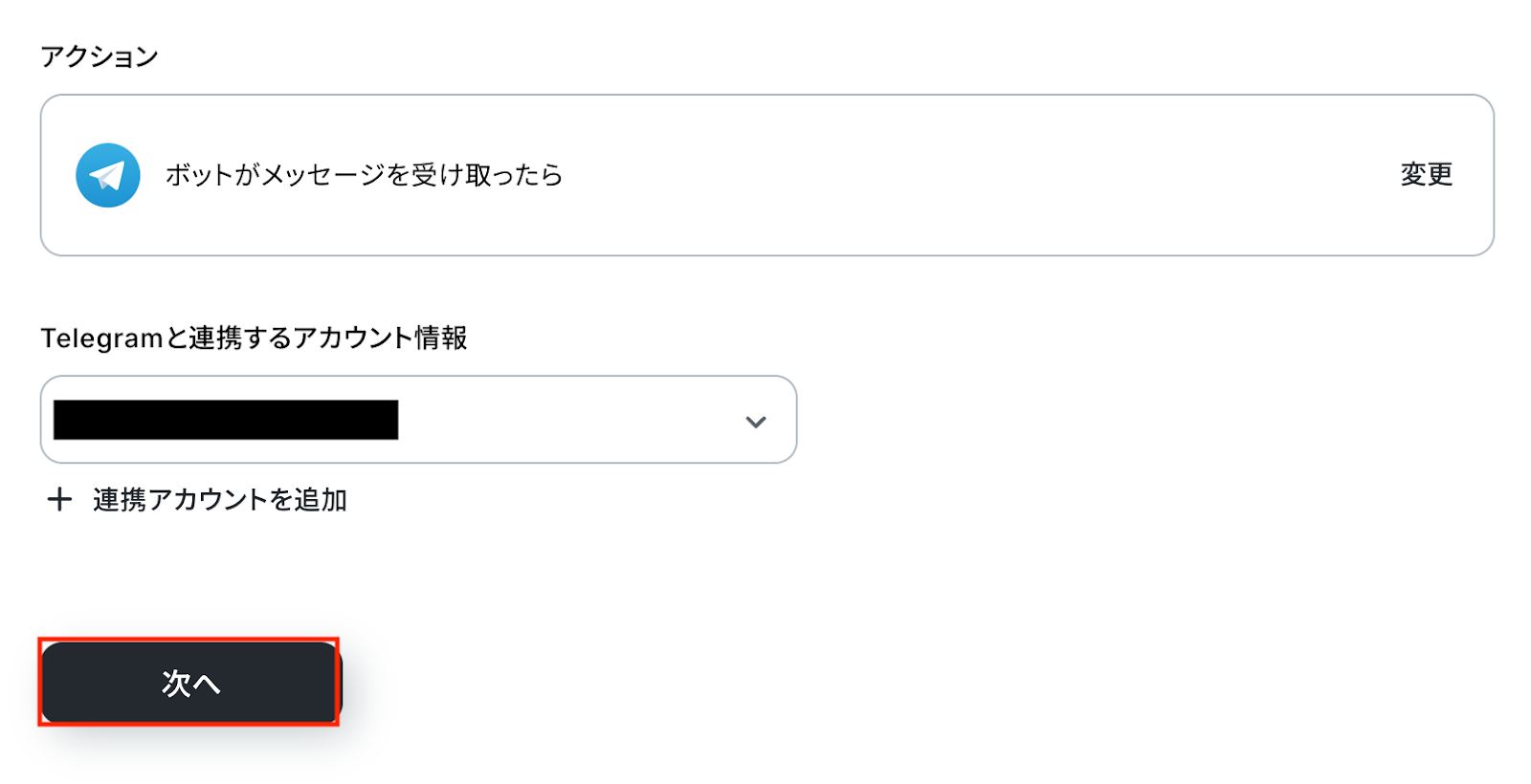 Telegramと連携するアカウント情報に問題がなければ、「次へ」をクリックします。