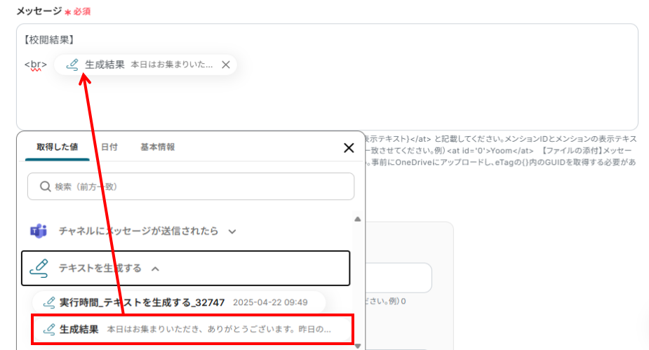 メッセージ:Microsoft Teamsに投稿したいメッセージ内容を入力します。 下記のように、アウトプットよりAI生成結果を活用しましょう。