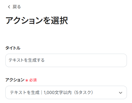 2.アクションを選択 「タイトル」と「アクション」を任意で編集してください。 「アクション」は、デフォルトで「テキストを生成 | 1,000文字以内(5タスク)」が選択されています。 ※()内に表記されている消費タスク量にご注意ください。