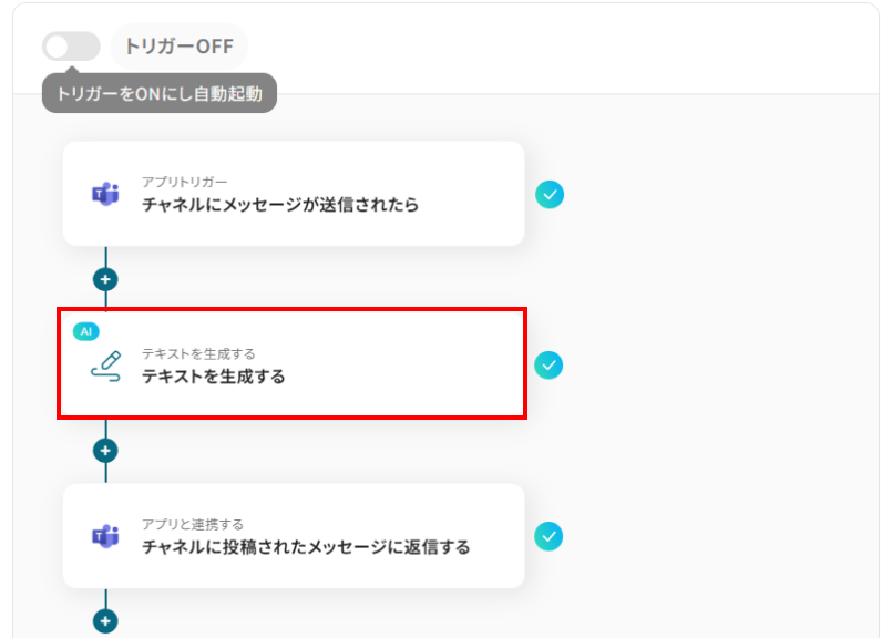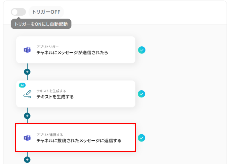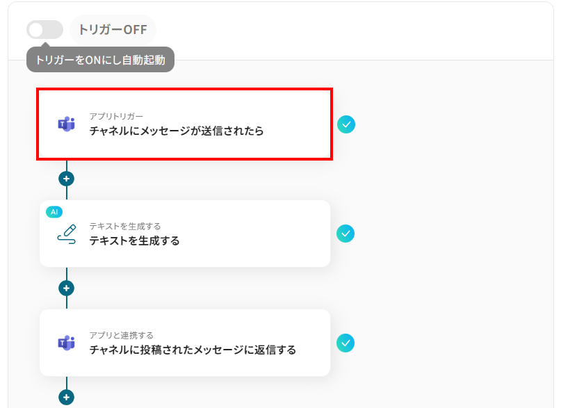 はじめに、Microsoft TeamsをYoomと連携します。 次に、トリガーでMicrosoft Teamsを選択し「チャネルにメッセージが送信されたら」というトリガーアクションを設定します。 続いて、オペレーションでAI機能の「テキストを生成する」アクションを選択し、トリガーで取得したメッセージを校閲するよう設定します。 最後に、オペレーションでMicrosoft Teamsの「チャネルに投稿されたメッセージに返信する」アクションを設定し、AIが生成した校閲結果を返信します。 ※「トリガー」:フロー起動のきっかけとなるアクション、「オペレーション」:トリガー起動後、フロー内で処理を行うアクション