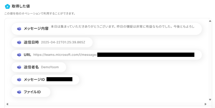 入力が完了したら、「テスト」を実行してください。 テストが成功すると、下記のようなアウトプットが表示されます。 先ほどMicrosoft Teamsに投稿したメッセージ内容が反映していればOKです!
