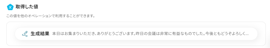 AI機能の「テキストを生成する」オペレーションでは、プロンプト(指示文)を自由に設定し、どのような文章を作成するかを細かく指定することが可能です。 Gmailの「メールを送る」オペレーションでは、件名や本文に、署名などの固定テキストやAIで生成した文章、Google スプレッドシートから取得した顧客名といった動的な値を埋め込むことができます。 ■注意事項