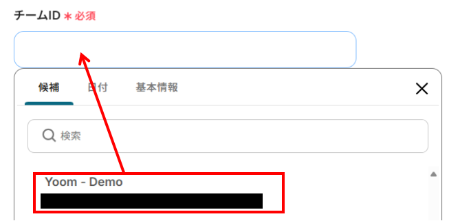 チームID:入力欄をクリックし、ステップ3で設定したMicrosoft Teamsのチームを選択してください。