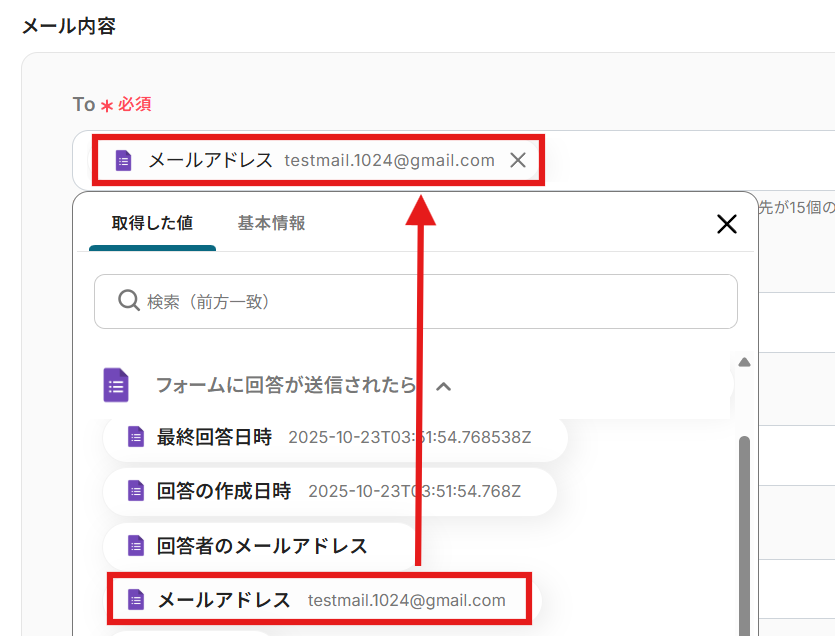取得した値の中から、送信する宛先になるメールアドレスを選びましょう。