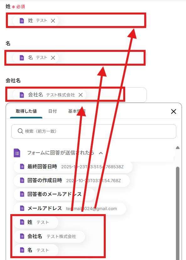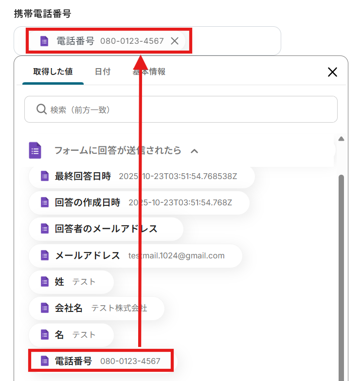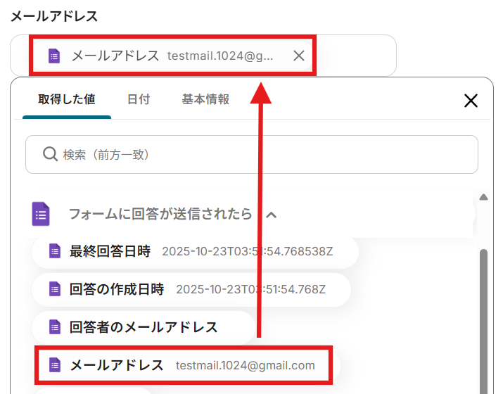 入力欄をクリックすると表示される取得した値の中から選びましょう。