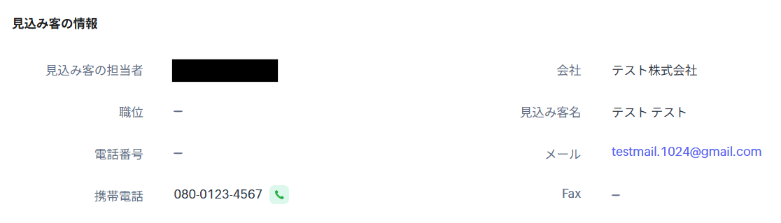 テストが成功すると、Zoho CRMに見込み客の情報が作成されていますので、確認してみてください。