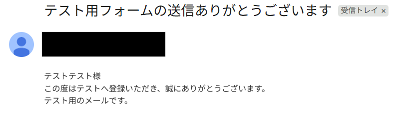 テストが成功すると、宛先として設定したメールアドレス宛に、先ほど作成した内容のメールが送信されていますので確認してみてください。
