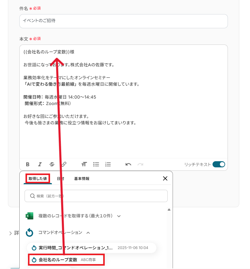 「件名」と「本文」も、取得した値からループ変数を用いて設定できます。