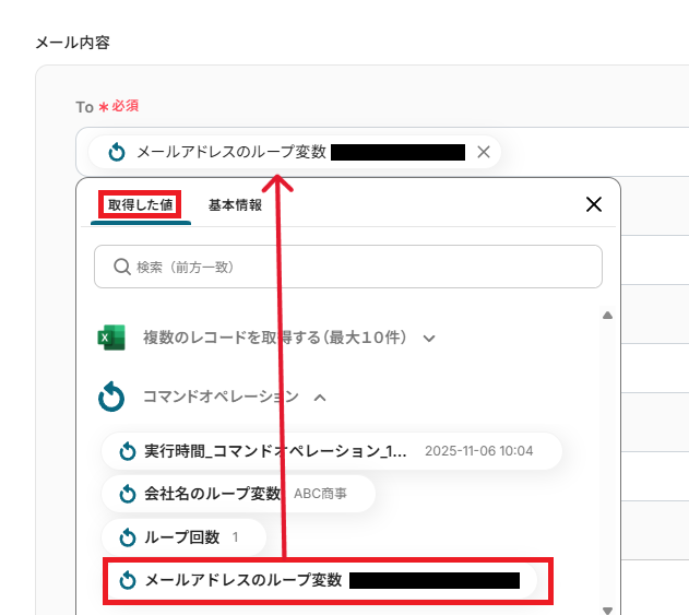 「To」は、メールアドレスのループ変数を活用し設定しましょう。
