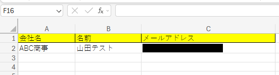 最初に、テストで使用するメール送信リストをMicrosoft Excelで作成しておきましょう。