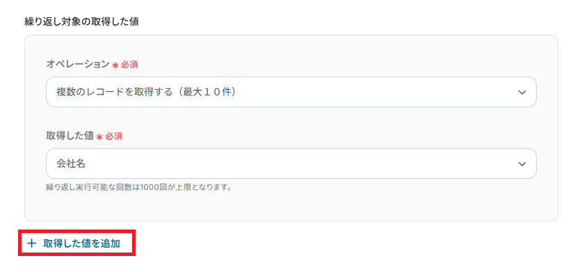 今回は「会社名」と「メールアドレス」の2項目を使用するため、「+取得した値を追加」をクリックし、設定項目を増やしましょう。