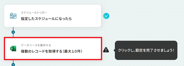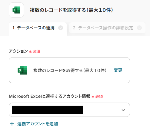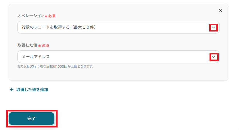 「オペレーション」のプルダウンから、「複数のレコードを取得する(最大10件)」を選択。