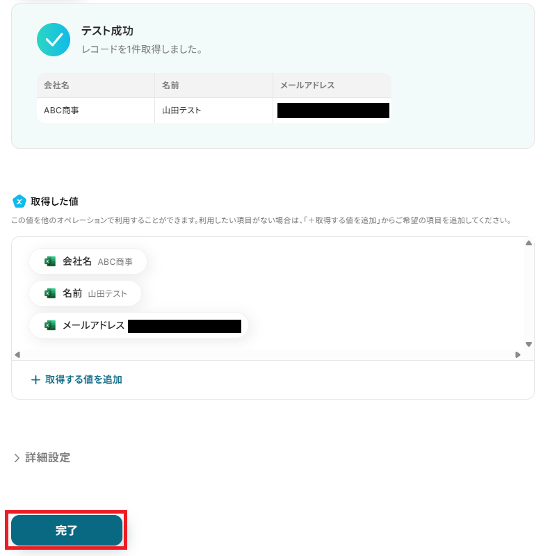 必要なレコードが取得されていることを確認し、「完了」をクリックしてください。