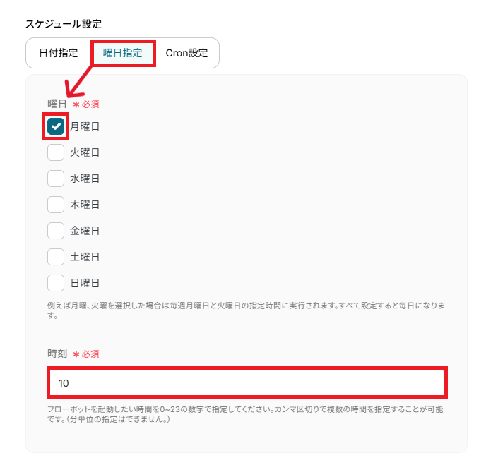 曜日指定以外にも、日付指定やCron設定を使用して自由なタイミングを指定することができます。