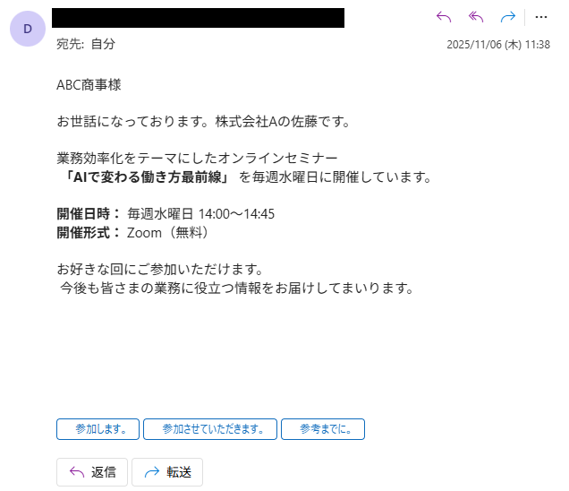 ・件名/本文:任意の文章を入力します。①で取得した社名や名前を埋め込むこともできます。