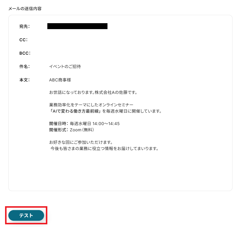・テスト:次ページでテストを行うことも可能です。ただし、実際にメールが送付されるので宛先にはご注意ください。
