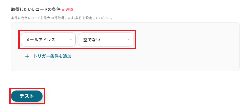 今回は全てのレコードを対象とするため、「メールアドレス」が「空でない」を条件として設定しています。